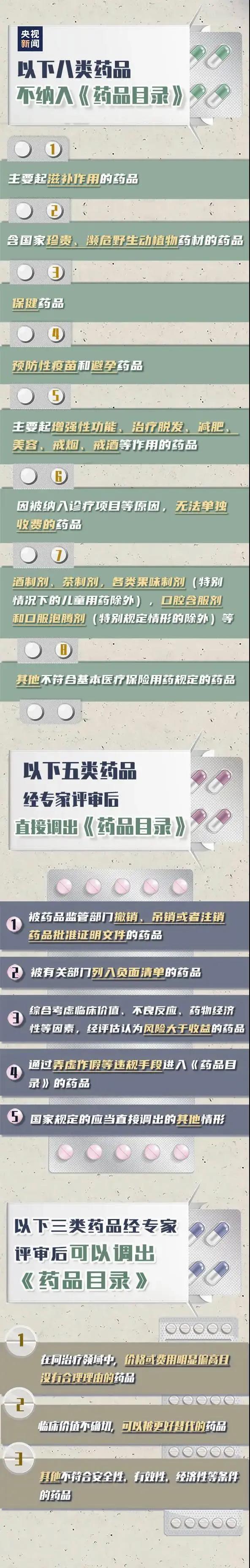 另外辦法明確了包括預防性疫苗,滋補藥品,保健藥品,脫發、美容減肥類等在內的八類不得進入《藥品目錄》的藥品;規定了醫保基金的支付辦法等。 日常就醫問藥時 還有哪些藥品不可報銷? 藥品調入、出《藥品目錄》的標準是啥? 哪些可以用醫保基金支付? 一圖了解↓