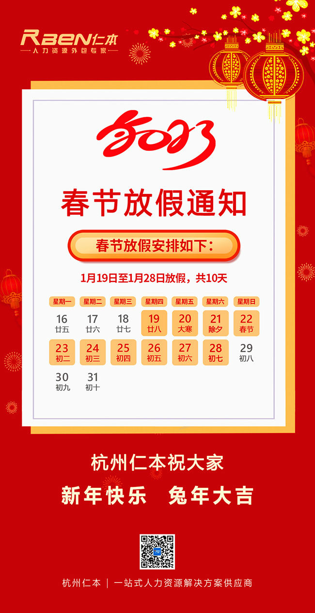 杭州仁本春節假期為:2023年1月19日至1月28日放假,共10天,1月29日正式上班。