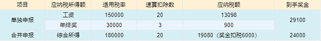 原理上來說,就是兩種計稅方式,產(chǎn)生了一些差異,導致需納稅金額不同。 那么年終獎單獨申報和并入綜合所得申報該如何選擇?哪個更節(jié)稅呢? 1、年終獎單獨申報 應納稅額=全年一次性獎金收入×適用稅率-速算扣除數(shù) 適用稅率:以全年一次性獎金收入除以12個月得到的數(shù)額對照月度稅率表確定: