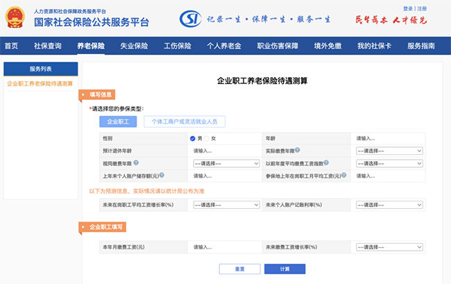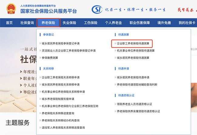 第一步:登錄“國家社會保險公共服務平臺”,找到“養老保險—企業職工養老保險待遇測算”。