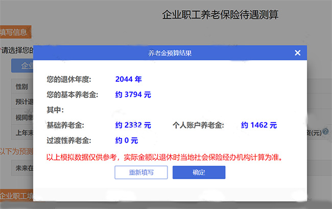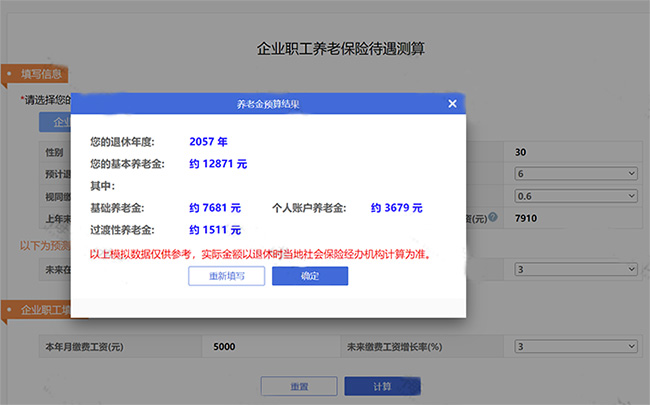 (注:這個計算器只是根據假設數據,推算出最終退休金。實際情況,可能和推算的會有差別。因此,舉例僅供參考,每個人的養老金根據當地工資水平、繳費年限、繳費檔次的不同而不一樣。)