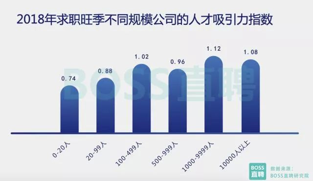 BOSS直聘研究院發現,在2018年跳槽旺季,1000-9999人規模的公司由于發展穩定系數高,且應聘難度及競爭壓力略低于萬人大廠,最受求職者歡迎。相比之下,中小企業在這個旺季依然面臨人才難求的困境。