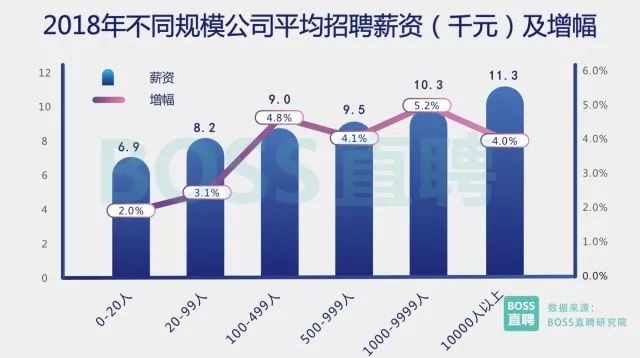 為了緩解人才招聘困境,具有一定實力的中等規模公司開始通過調整薪資爭搶人才,這一幕和4年前移動 互聯網創業大潮剛剛開始的時候十分相似。2018年,100-499人規模的企業,平均薪資增幅為4.8%,高于一萬 人以上規模的巨頭,僅次于處在最旺盛發展階段的1000-9999人企業。