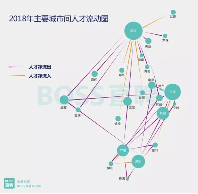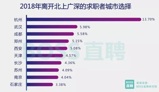 BOSS 直聘研究院數據顯示,2018年前兩個月,一線城市(北上廣深)人才繼續流出至二三線城市,凈流出率達到 0.6%,較2017年同期增加0.05個百分點。