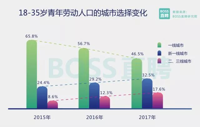 BOSS直聘研究院數據顯示,近三年來,工作首選城市為北上廣深的18-35歲青年勞動者比例迅速下降,從 2015年的65.8%下降至2017年末的46.5%。選擇新一線城市的青年勞動者比例直線上升,選擇二三線城市的年輕 人比例也較2015年翻倍。