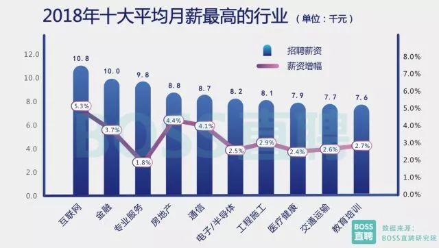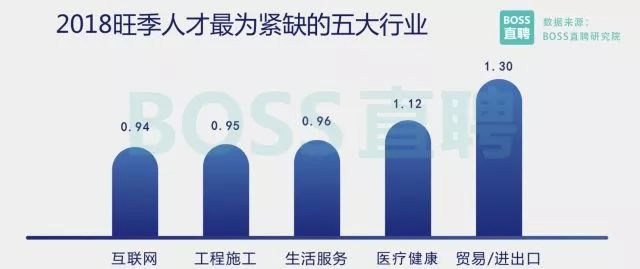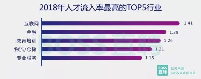 根據BOSS直聘研究院的觀察,2018年求職旺季,人才流入率最高的五個行業中,互聯網和金融行業依然穩 居前兩名。