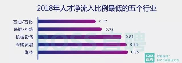 BOSS直聘研究院發現,石油/石化和采掘/冶煉行業人才的流入/流出比連續三年下降,2018年跌破0.75。