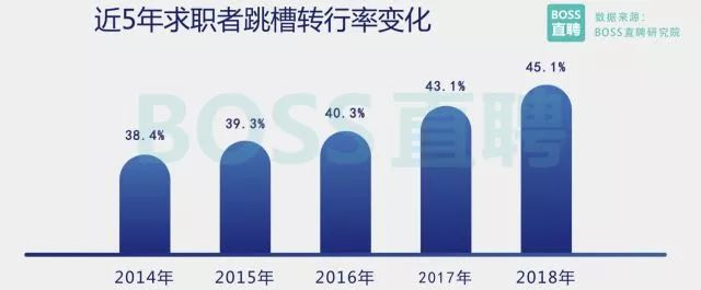 BOSS直聘研究院數據顯示,2018 年,全行業人才整體轉行率已達45.1%,較5年前增加近7個百分點,轉行現象正變得愈發普遍,產業間的人才流 動正在迅速增長。