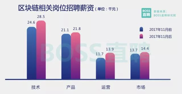 2017年11月之前,區塊鏈相關崗位的平均招聘薪資為2.32萬元。2017年11月之后,區塊鏈相關崗位的平均 招聘薪資達到2.58萬元。