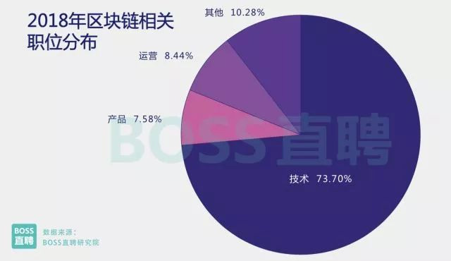從職位分布上看,有73.7%的區塊鏈相關崗位為技術類,7.5%為產品類、 8.4%為運營類,還有10%其他崗位(包括行業分析師、市場推廣、記者等)。