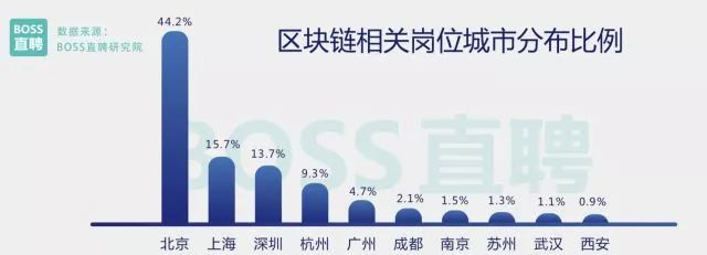 目前,區塊鏈相關崗位的發布地區分布高度集中,北上杭深占比超8成。