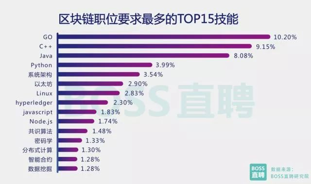 BOSS直聘研究院發現,超過80%的區塊鏈相關職位對求職者的技能要求在3項及以上,技術類人才除了需掌 握常用開發語言外(C++,Java,Go),還需要對密碼學、共識算法、超級賬本、智能合約等有足夠了解。