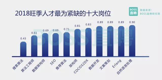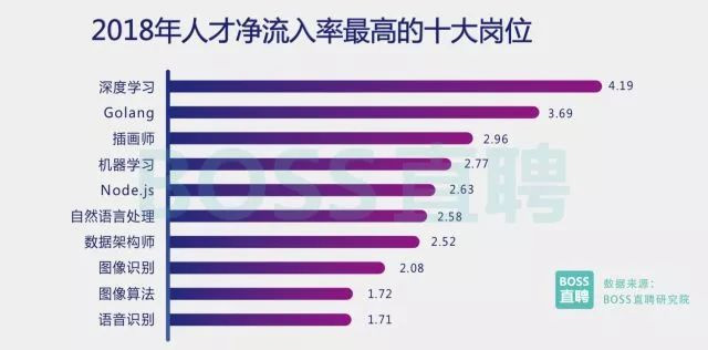 BOSS直聘研究院數據顯示,2018年求職旺季轉入AI、區塊鏈相關崗位的人才數量較2017年同期翻了3倍以 上,大數據、插畫師等崗位也極受歡迎。