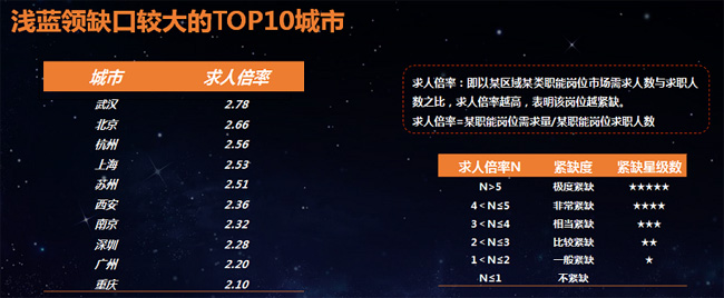 城市淺藍領求人倍率指數 “淺藍領”供需呈現中心城市對周邊區域的“虹吸”效應。一線城市“淺藍領”主要來自周邊省份,非一線城市多來自省內。從招聘規模來看,北上廣深的招聘規模位于第一梯隊,武漢、成都緊隨其后。從求職端來看,“淺藍領”最愿意去的城市為上海,其次為廣州,深圳,成都也較受“淺藍領”歡迎,北京由于實施人口疏解政策,整體生活成本較高,在“淺藍領”求職意向城市中位居第五位。為了對比各城市“淺藍領”崗位緊缺程度,白皮書采用了求人倍率指標,指標顯示,武漢“淺藍領”缺口*大,其次為北京。