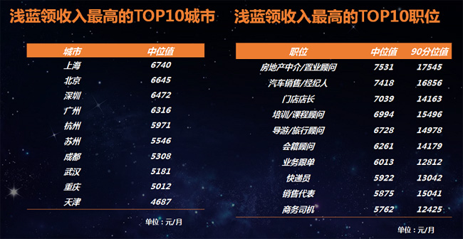 淺藍領收入TOP10城市&職位 上海是“淺藍領”收入最高的城市,中位值為6,740元,其次是北京,中位值為6,645元(注:白皮書中月薪指稅前應發工資,包括績效獎金)。非一線城市中,杭州、蘇州“淺藍領”薪酬相對領先。此外,成都、武漢等熱點城市隨著服務業快速發展,“淺藍領”薪酬中位值達到5,000元以上。“淺藍領”從業者中,房地產中介/置業顧問、汽車銷售/經紀人、門店店長位列前三。業務跟單、快遞員、銷售代表、商務司機等收入也比較亮眼。另外數據顯示,“淺藍領”繳納社會保險意愿整體不高,其中40.5%的“淺藍領”不愿繳納社保,希望足額繳納社保占比為27.4%。“淺藍領”普遍年輕,職場穩定性較差,更希望獲得更多現金性收入,這亦給企業合規繳納社保帶來一定挑戰。 |