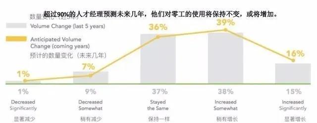 凱利《零工經(jīng)濟(jì)報(bào)告》表明:全球有65%的企業(yè)在雇傭或使用零工,并有超過90%的人才經(jīng)理預(yù)測(cè),未來(lái)幾年里,他們對(duì)零工的使用將保持不變,甚至還將進(jìn)一步增加。