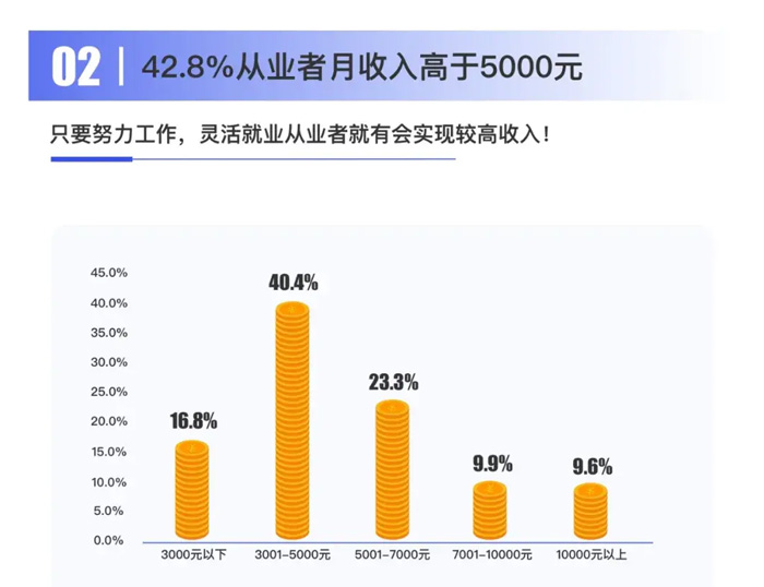 報告顯示,靈活就業催生了不少新職業,包括線上運營、騎手、直播、網課老師、健身教練等。新職業行業主要集中在互聯網、電商、新零售等新經濟類的生活服務業。 趨勢二:42.8%靈活就業從業者月收入高于5000元