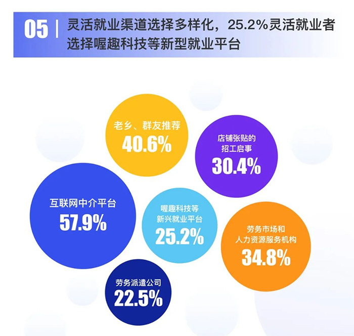 針對靈活就業的未來趨勢,喔趣科技創始人兼CEO儲峰表示:“過去的靈活就業指的是人崗匹配,就是把不同的人安排在不同的崗位上。真正的靈活就業實際上是任務與時間的匹配,把企業提供的崗位變成了任務,把勞動者從個體變成了時間。當勞動者的時間顆粒度更細的時候,他可以同時擁有2-3個任務,任務可以是在不同的商家、不同的店鋪工內完成任務。” 趨勢五:靈活就業渠道選擇多樣化,25.2%靈活就業者選擇喔趣科技等新型就業平臺