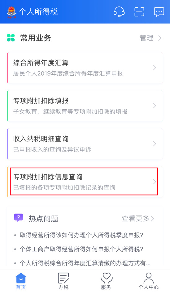 6、查看確認您的專項附加扣除是否填報正確在首頁依次點擊【常用業務】-【專項附加扣除信息查詢】,選擇“2020年度”,可查看您已填報的專項附加扣除信息。