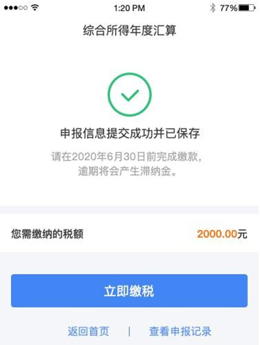 若暫不繳款可以選擇【返回首頁】或【查看申報記錄】, 后續可再次進行繳款。注意:需要在2020年6月30日前完成繳款,逾期會有滯納金的。