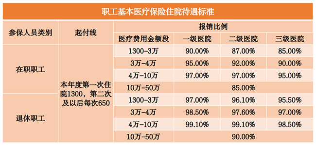 住院報(bào)銷 本市在職職工住院報(bào)銷比例在85%以上,退休人員住院報(bào)銷比例在90%以上,最高可達(dá)99.1%,住院封頂線為50萬元。