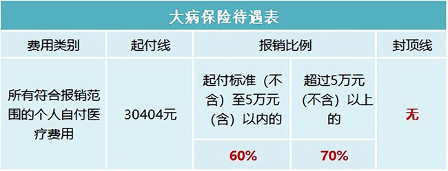 注: ①上表住院起付線特指本年度首次住院,老年人和勞動(dòng)年齡內(nèi)居民本年度第二次及以后住院,起付線減半。 ②學(xué)生兒童的住院起付線均減半。 ③區(qū)屬三級(jí)定點(diǎn)醫(yī)院住院報(bào)銷比例為78%。 二、大病醫(yī)療保險(xiǎn)待遇 自2023年起,北京市大病醫(yī)療保障起付標(biāo)準(zhǔn)將調(diào)整為30404元。 特困供養(yǎng)人員、最低生活保障對(duì)象以及生活困難補(bǔ)助人員、城鄉(xiāng)低收入家庭救助人員等困難人群,大病醫(yī)療保障起付標(biāo)準(zhǔn)將降低50%。