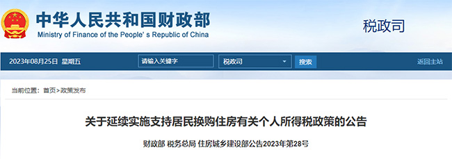 財政部此前發布《關于延續實施支持居民換購住房有關個人所得稅政策的公告》。