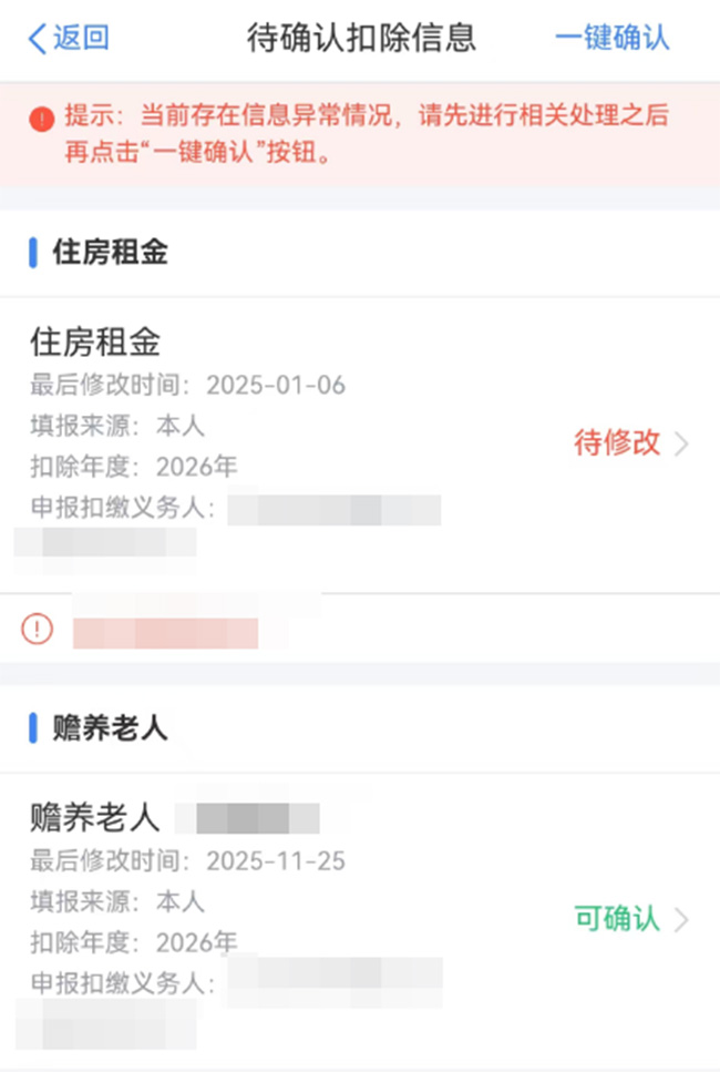 若存在信息異常情況,需要進行處理后再點擊【一鍵確認】。